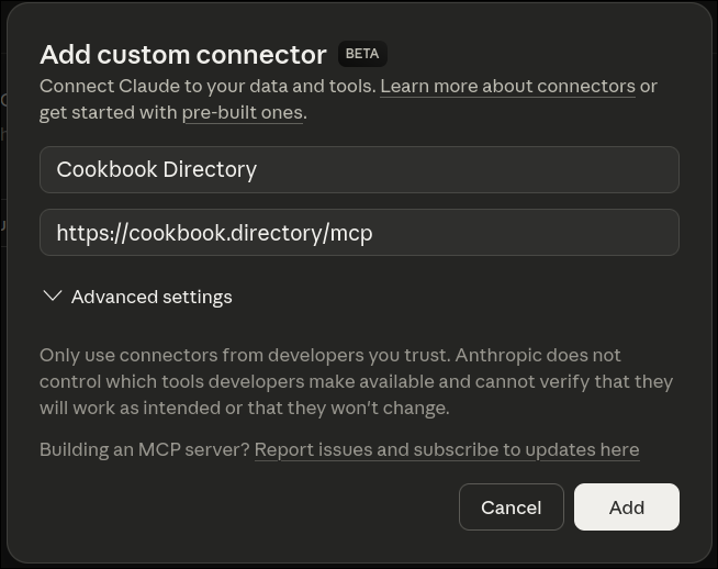 Add Cookbook Directory as an integration directly from your Claude settings — no software to install.